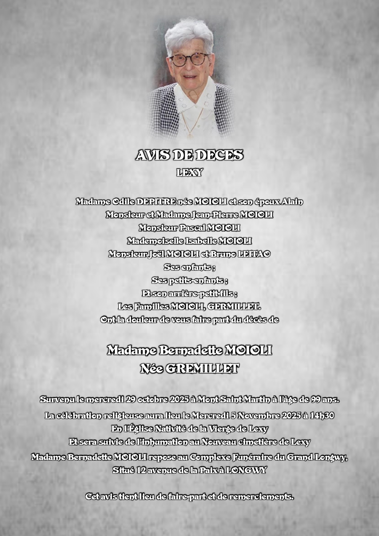 C’est avec une grande tristesse que nous vous annonçons le décès de Bernadette MOIOLI survenu le mercredi 29 octobre 2025 à Mont-Saint-Martin.