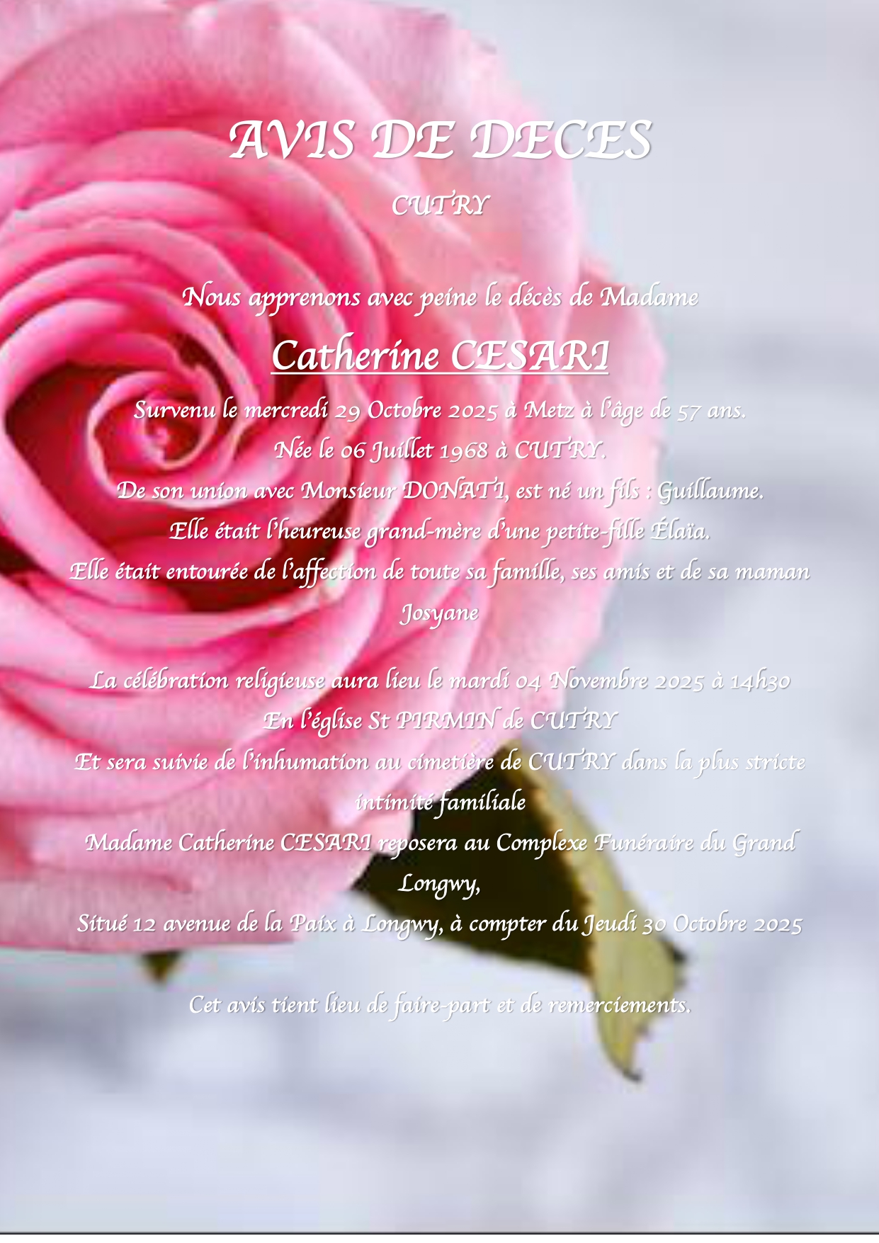 C’est avec une grande tristesse que nous vous annonçons le décès de Catherine CESARI survenu le mercredi 29 octobre 2025 à Metz.