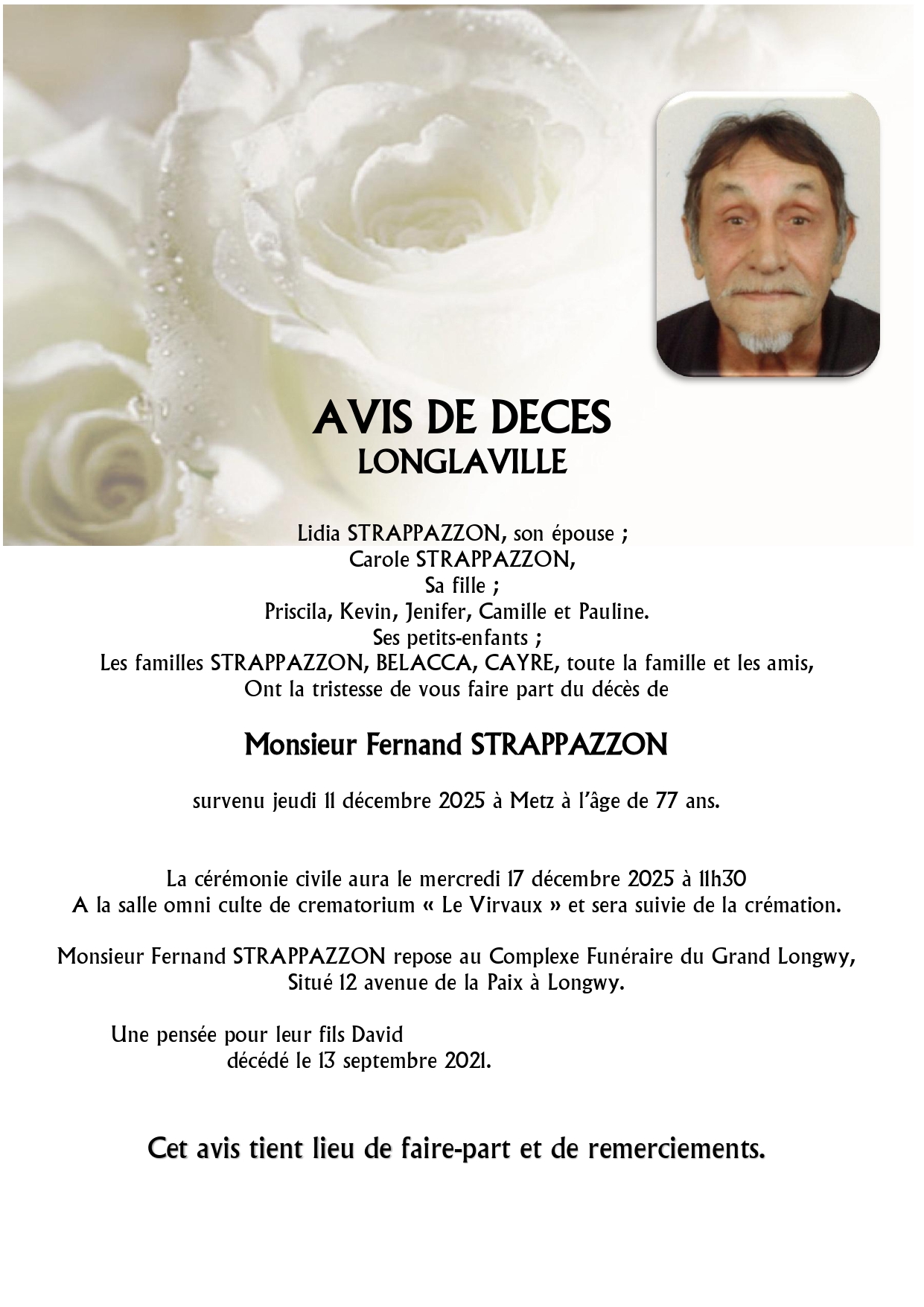 C’est avec une grande tristesse que nous vous annonçons le décès de Fernand Louis Jean STRAPPAZZON survenu le jeudi 11 décembre 2025 à Metz.