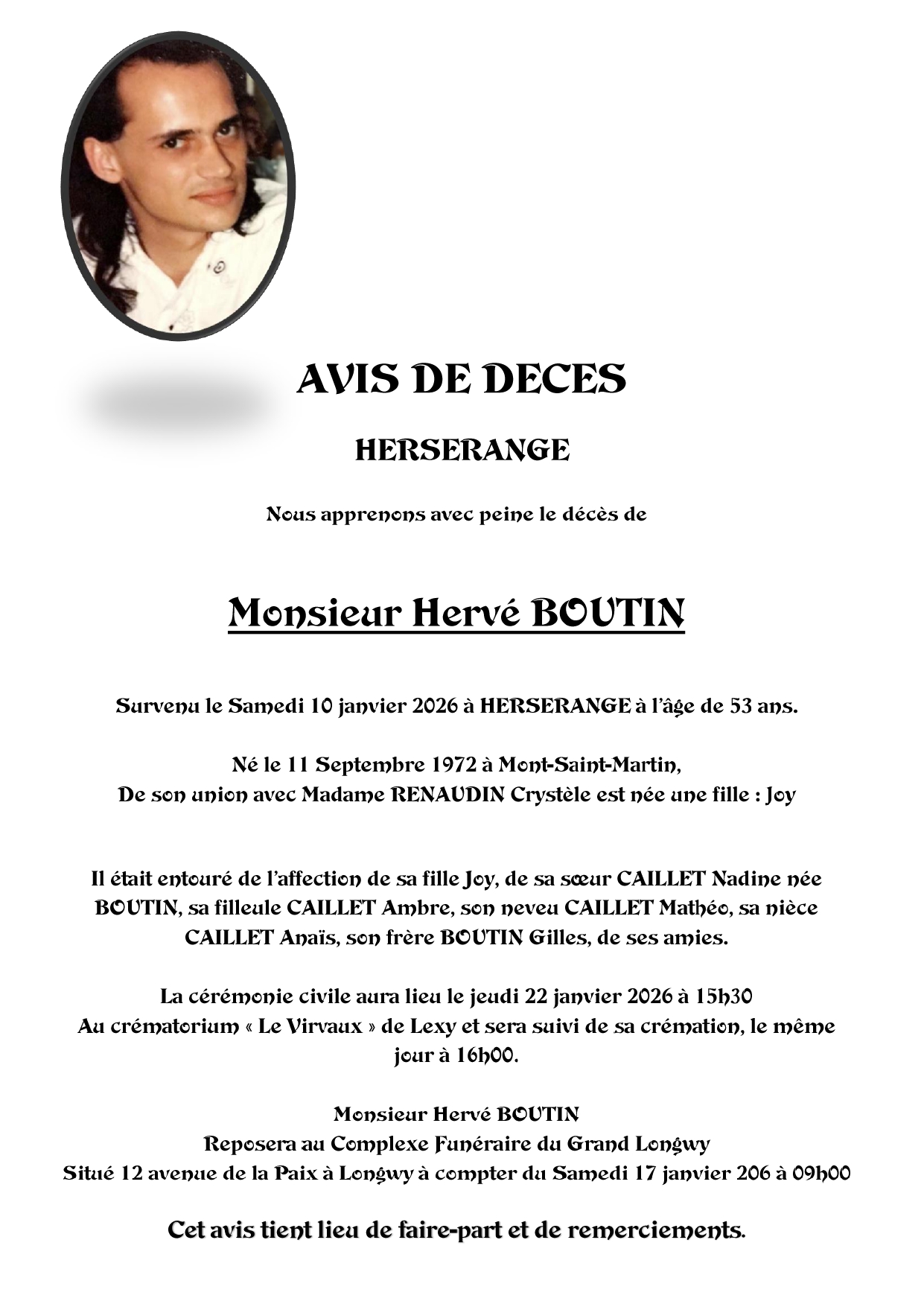 C’est avec une grande tristesse que nous vous annonçons le décès d’Hervé BOUTIN survenu le samedi 10 janvier 2026 à Herserange.