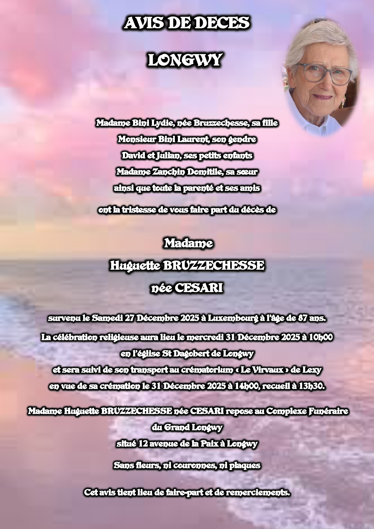 C’est avec une grande tristesse que nous vous annonçons le décès d’Huguette BRUZZECHESSE survenu le samedi 27 décembre 2025 à Luxembourg.