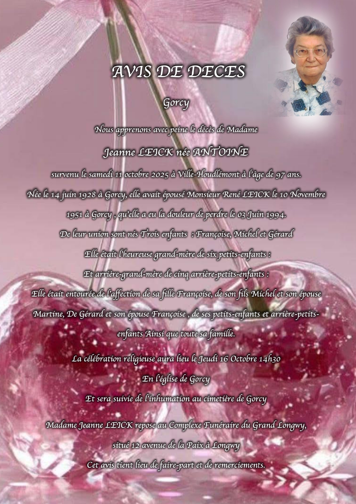 C’est avec une grande tristesse que nous vous annonçons le décès de Jeanne LEICK survenu le samedi 11 octobre 2025 à Ville-Houdlémont.