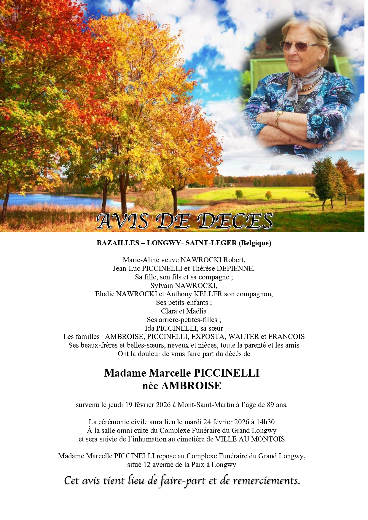 C’est avec une grande tristesse que nous vous annonçons le décès de Marcelle PICCINELLI survenu le jeudi 19 février 2026 à Mont-Saint-Martin.