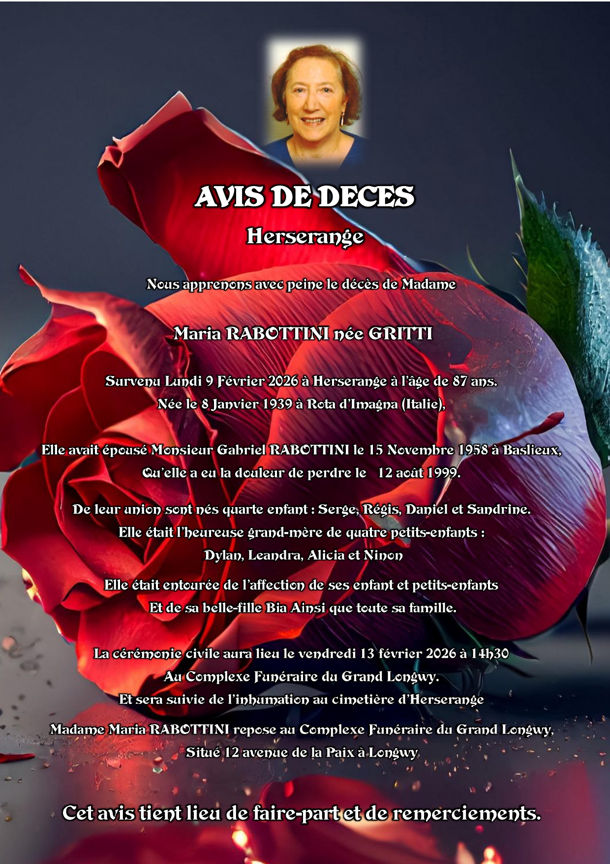 C’est avec une grande tristesse que nous vous annonçons le décès de Maria RABOTTINI survenu le lundi 09 février 2026 à Herserange.