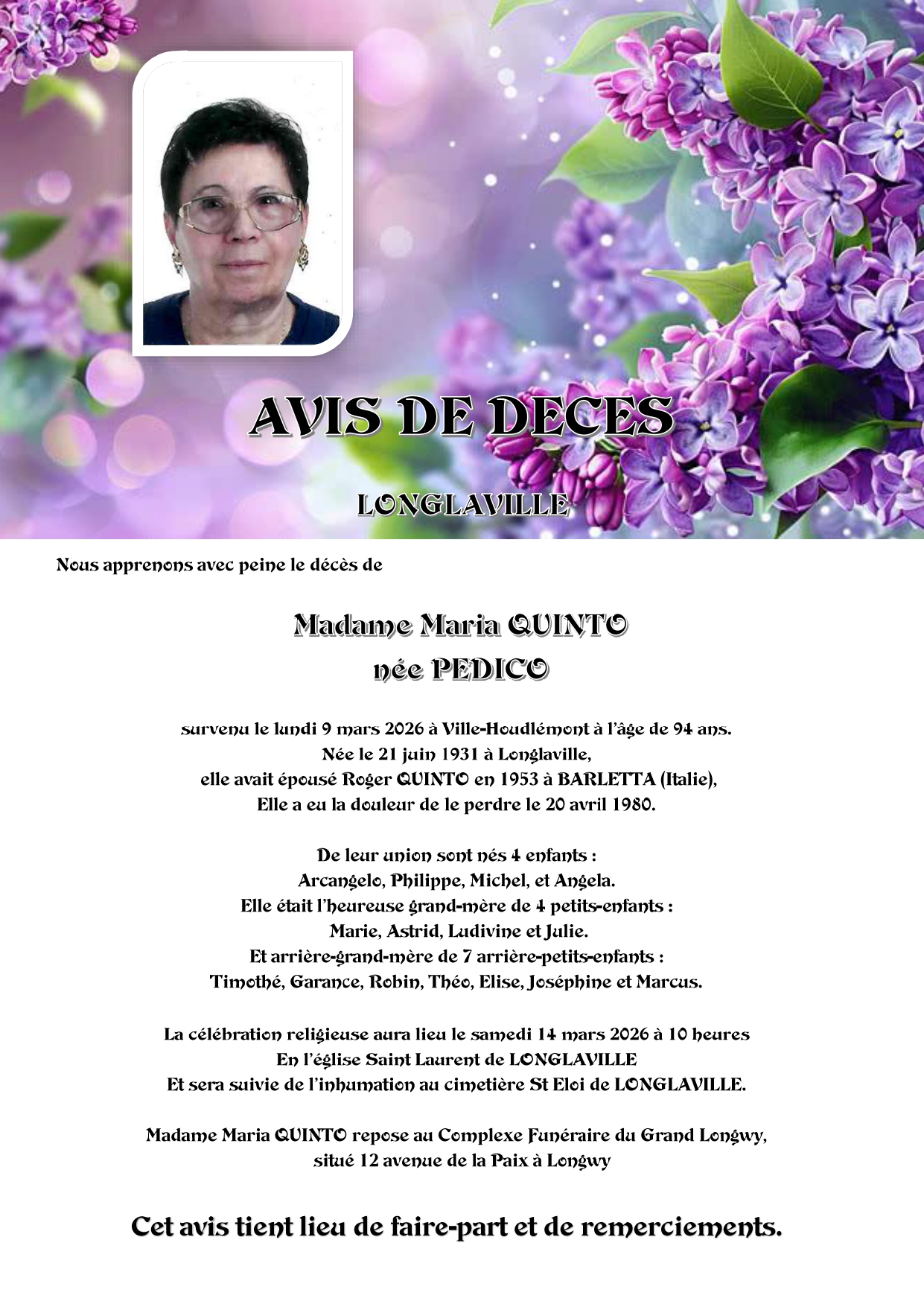 C’est avec une grande tristesse que nous vous annonçons le décès de Maria QUINTO survenu le mardi 10 mars 2026 à Ville-Houdlémont.