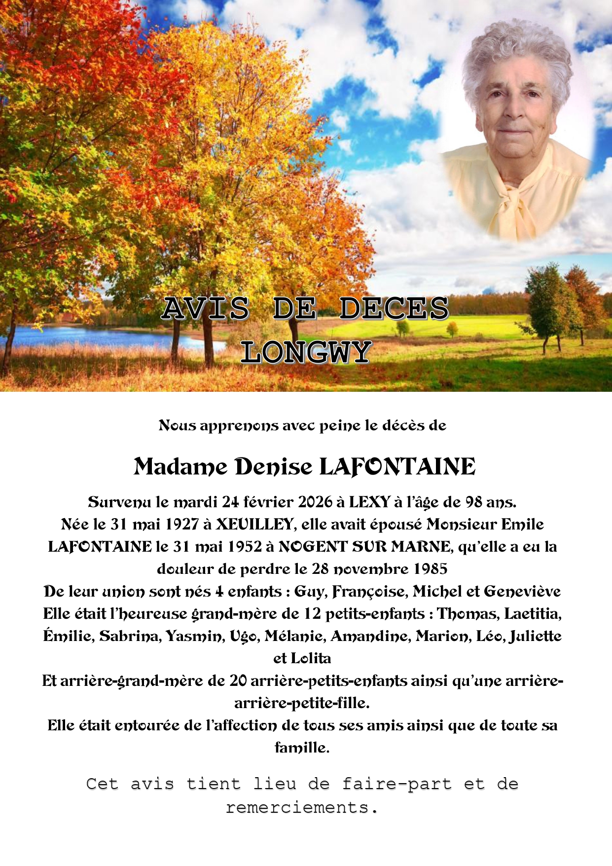 C’est avec une grande tristesse que nous vous annonçons le décès de Marie LAFONTAINE survenu le mardi 24 février 2026 à Lexy.