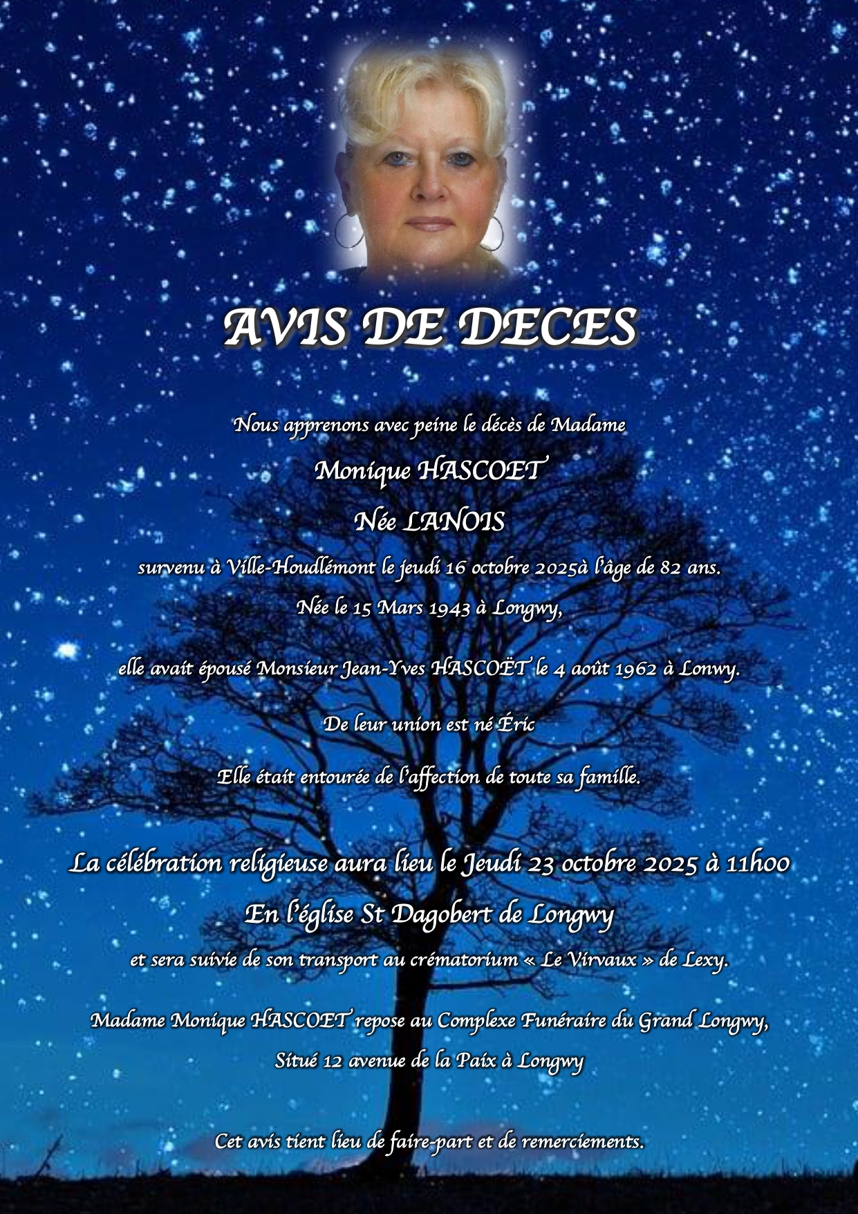 C’est avec une grande tristesse que nous vous annonçons le décès de Monique HASCOET survenu le jeudi 16 octobre 2025 à Ville Houdlemont. La cérémonie se déroulera le jeudi 23 octobre 2025 à 11h00 à en l'Église Saint Dagobert de Longwy.