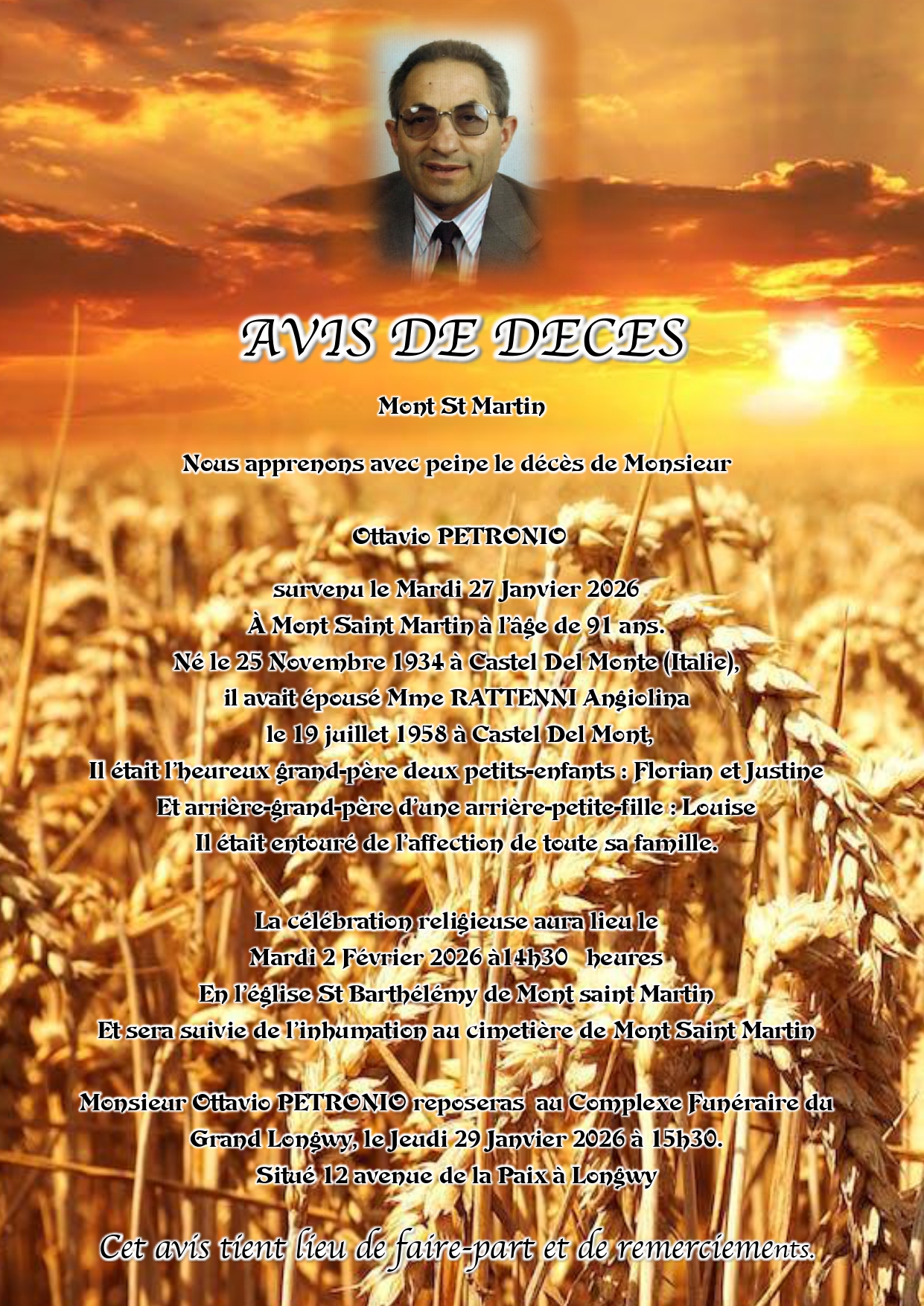 C’est avec une grande tristesse que nous vous annonçons le décès d’Ottavio PETRONIO survenu le mardi 27 janvier 2026 à Mont-Saint-Martin.
