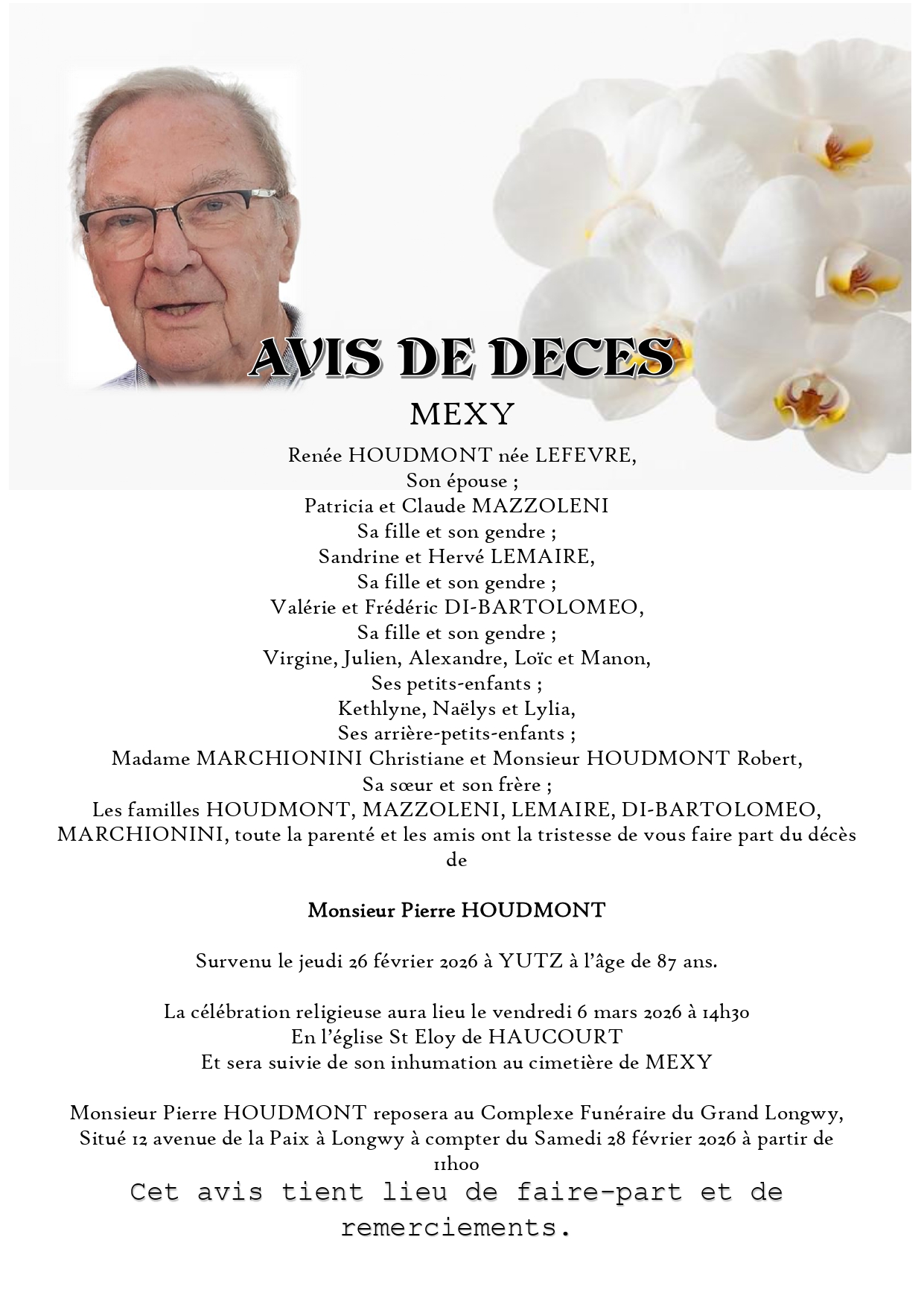 C’est avec une grande tristesse que nous vous annonçons le décès de Pierre HOUDMONT survenu le jeudi 26 février 2026 à Yutz.