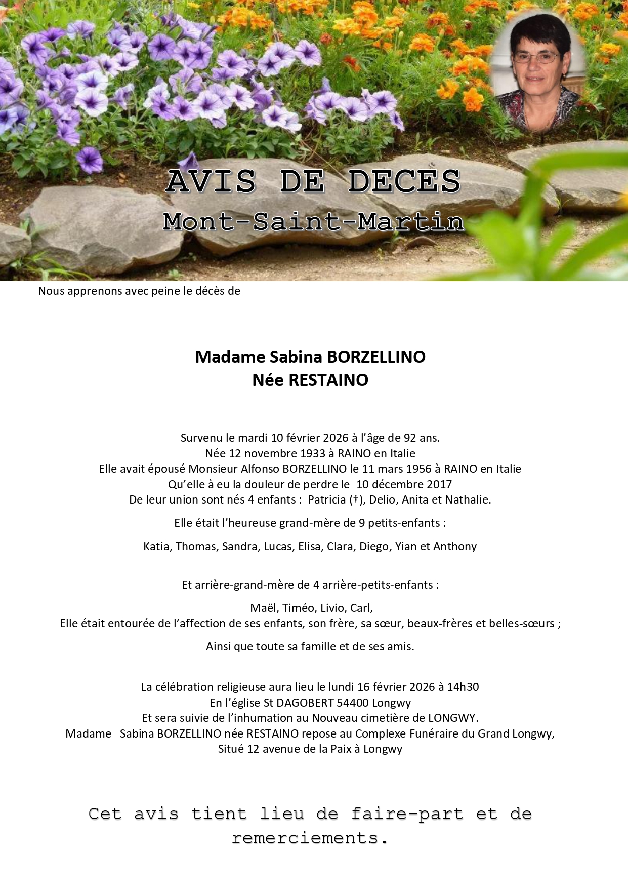 C’est avec une grande tristesse que nous vous annonçons le décès de Sabina BORZELLINO survenu le mardi 10 février 2026 à Mont-Saint-Martin. La cérémonie se déroulera le lundi 16 février 2026 à 14h30 à l’adresse suivante : Église Saint Dagobert - Place Darche - 54400 Longwy.